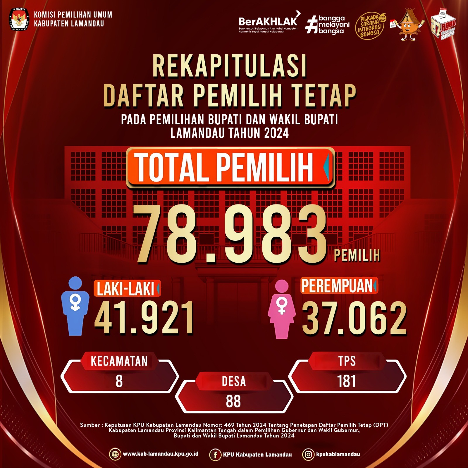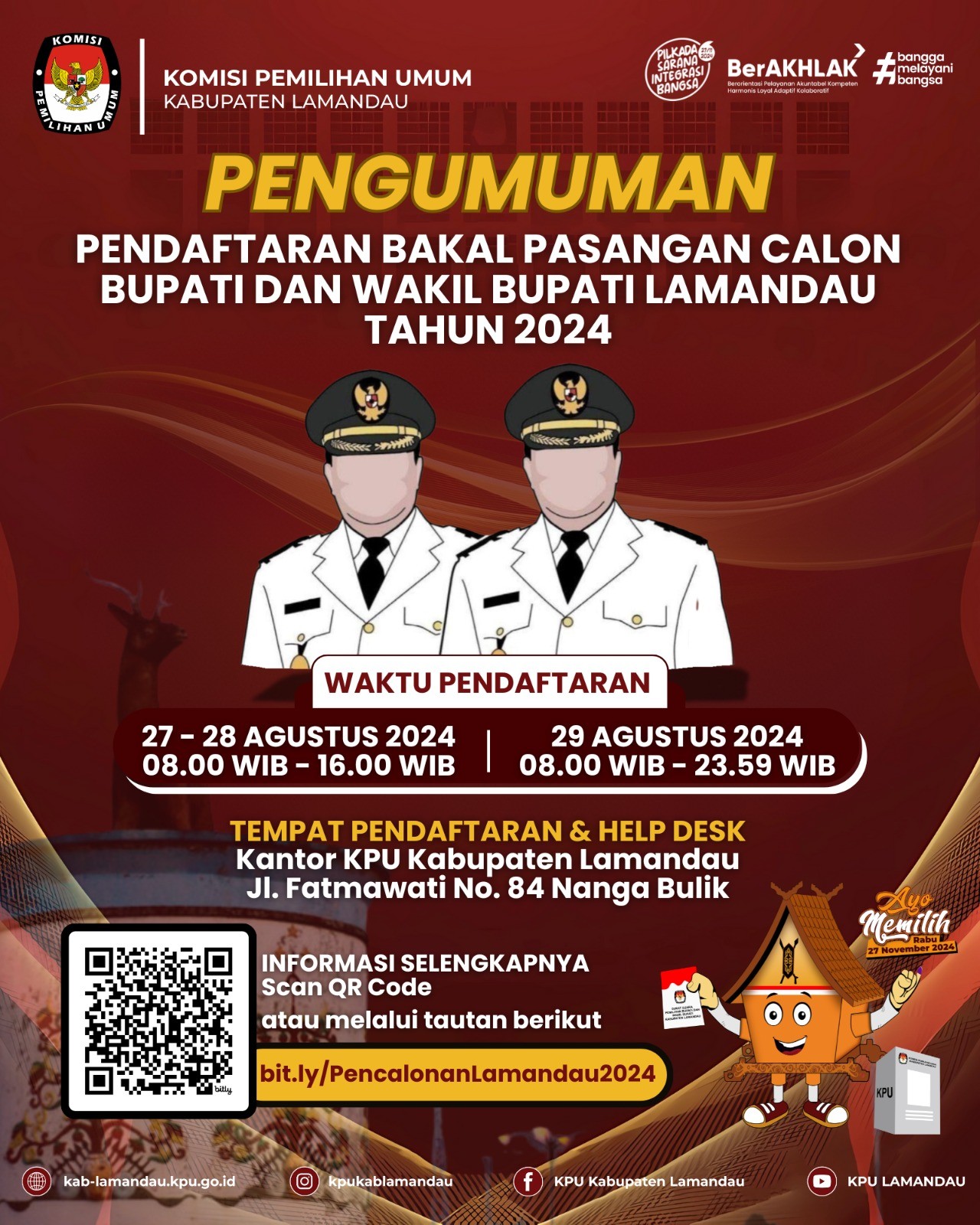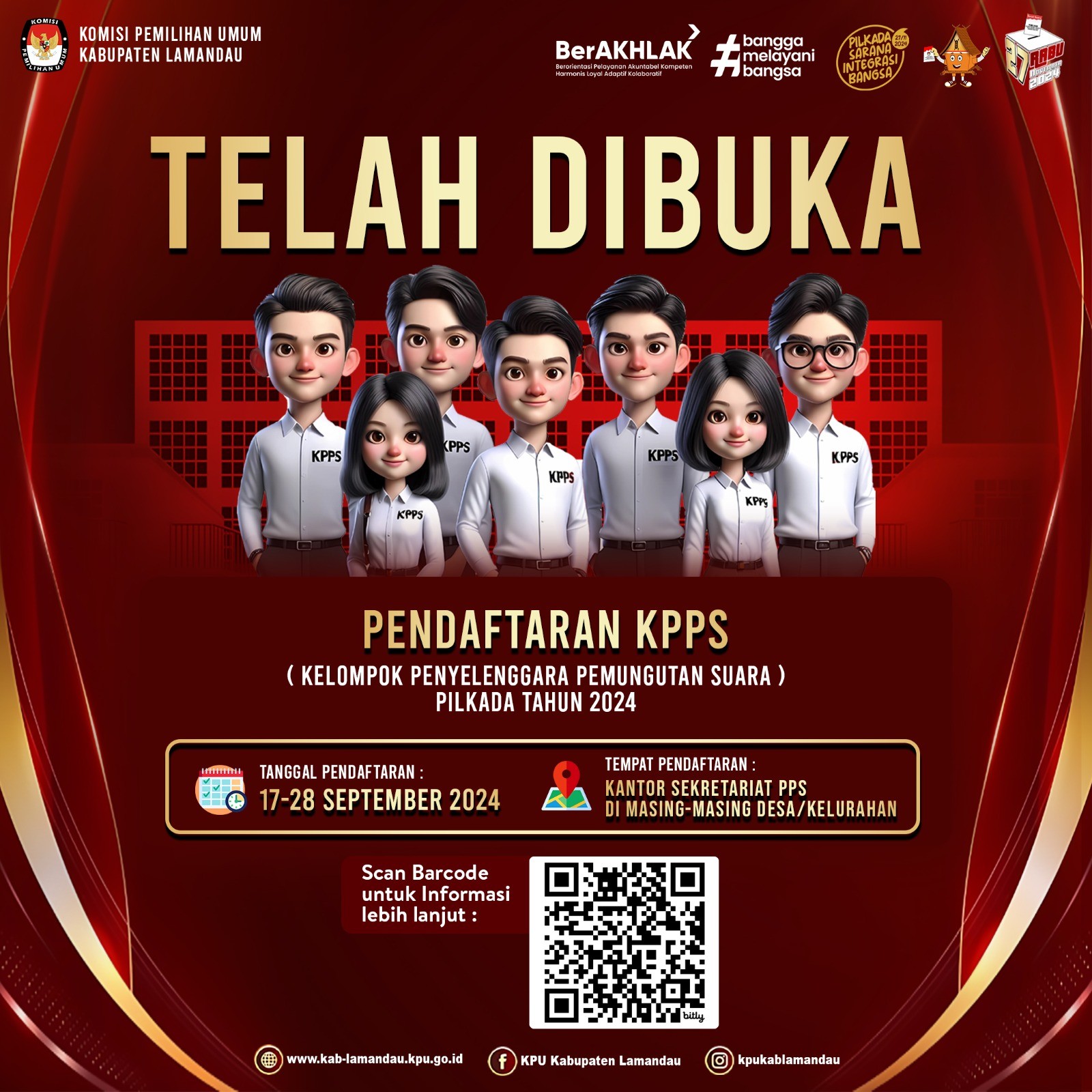 Berdasarkan Berita Acara Rapat Pleno PPS seluruh Kabupaten Lamandau tentang Penetapan Calon Anggota Kelompok Penyelenggara Pemungutan Suara Terpilih untuk Pilkada Tahun 2024, disampaikan hal-hal sebagai berikut: PPS menetapkan calon anggota KPPS peringkat 1-7 ditetapkan sebagai calon anggota KPPS terpilih dan calon anggota KPPS pada peringkat selanjutnya ditetapkan sebagai calon pengganti antarwaktu KPPS sebagaimana daftar terlampir. Sehubungan dengan hal tersebut di atas, KPU Kabupaten Lamandau mengundang calon anggota KPPS terpilih untuk hadir dalam pelantikan, pengambilan sumpah/janji, dan penandatanganan pakta integritas anggota KPPS pada: Hari                 : Kamis Tanggal           : 7 November 2024 Pukul               : Menyesuaikan Tempat             : Aula Kantor Desa/Kelurahan Pakaian            : Bebas Rapi Calon Anggota KPPS dapat melakukan konfirmasi kepada masing-masing PPS Desa/Kelurahan sesuai dengan wilayah kerja masing-masing. Demikian pengumuman ini disampaikan, untuk diketahui. Untuk lampiran bisa di donwload dengan klik link https://bit.ly/KPPSLMDPILKADA Atau scan Qr-code dibawah ini: