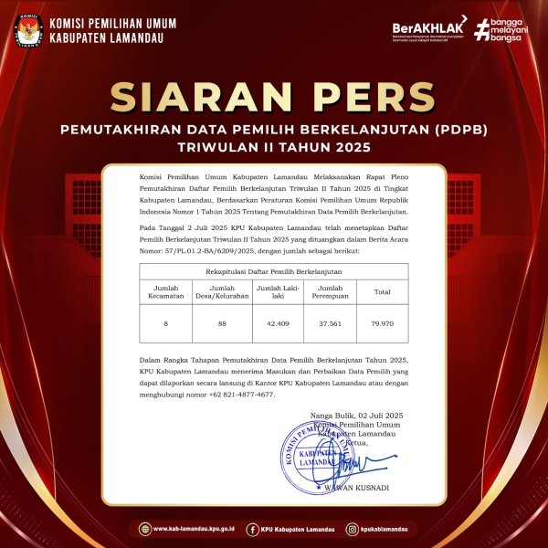 #TemanPemilih KPU Kabupaten Lamandau telah melaksanakan Rapat Pleno terbuka tentang Rekapitulasi Pemutakhiran Data Pemilih Berkelanjutan (PDPB) Triwulan 2 Tahun 2025.   Berikut Siaran Pers terkait Rekapitulasi Pemutakhiran Data Pemilih Berkelanjutan (PDPB) Triwulan 2 Tahun 2025 KPU Kabupaten Lamandau.   Sedikit mimin jelaskan, apakah itu PDPB? Berikut infografis terkait penjelasan tentang Pemutakhiran Data Pemilih Berkelanjutan (PDPB) Cekidot! Terima Kasih