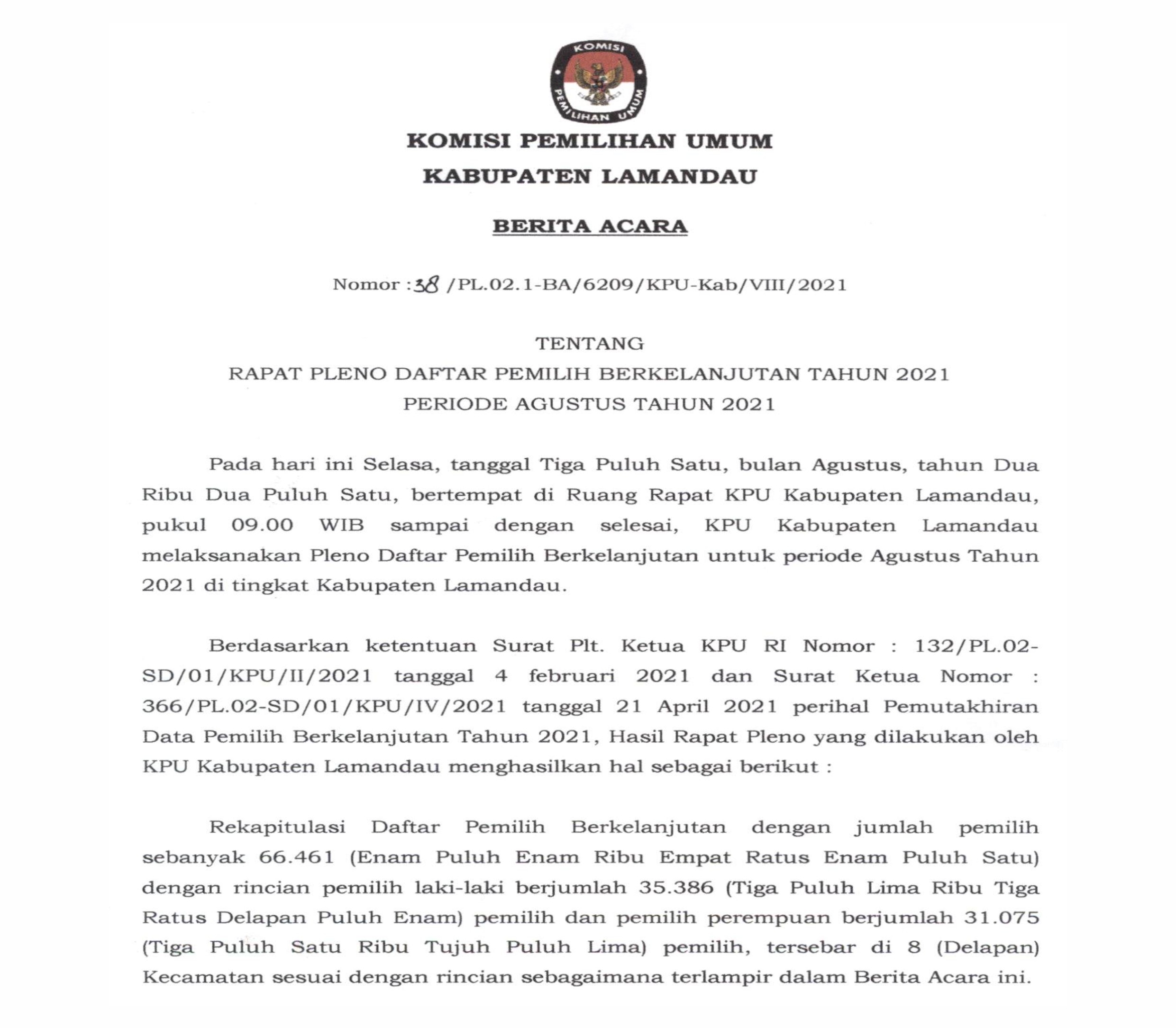 Pemutakhiran Daftar Pemilih Berkelanjutan bulan Agustus tahun 2021, Hasil Rapat Pleno Ketua dan Anggota Serta Sekretaris dan Kasubbag KPU Lamandau Tentang Data Pemilih Perubahan Hasil Pemutakhiran Data Pemilih Berkelanjutan Priode September Tahun 2021 dalam Siaran Pers yang telah KPU Lamandau Terbitkan mengalami perubahan data Sebagai Berikut :