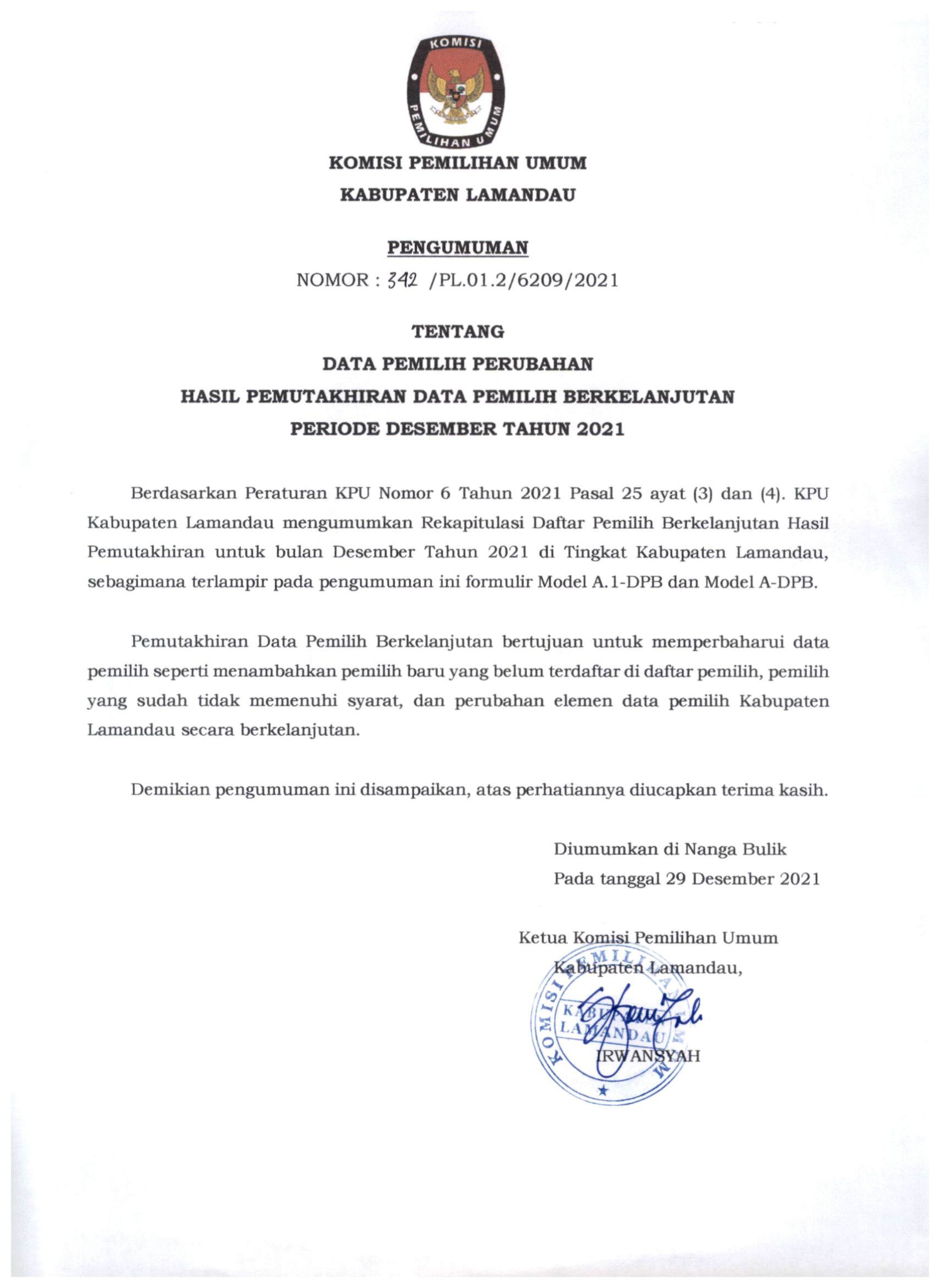 Komisi Pemilihan Umum Kabupaten Lamandau melaksanakan kegiatan Pemutakhiran Daftar Pemilih Berkelanjutan Periode Desember Tahun 2021. Berdasarkan Peraturan Komisi Pemilihan Nomor 6 Tahun 2021 tentang Pemutakhiran Data Pemilih Berkelanjutan. KPU Kabupaten Lamandau mengumumkan DPB yang terdiri atas : Jumlah Laki-laki : 35.424 Pemilih Jumlah Perempuan : 31.112 Pemilih, Jumlah Total : 66.536 Pemilih