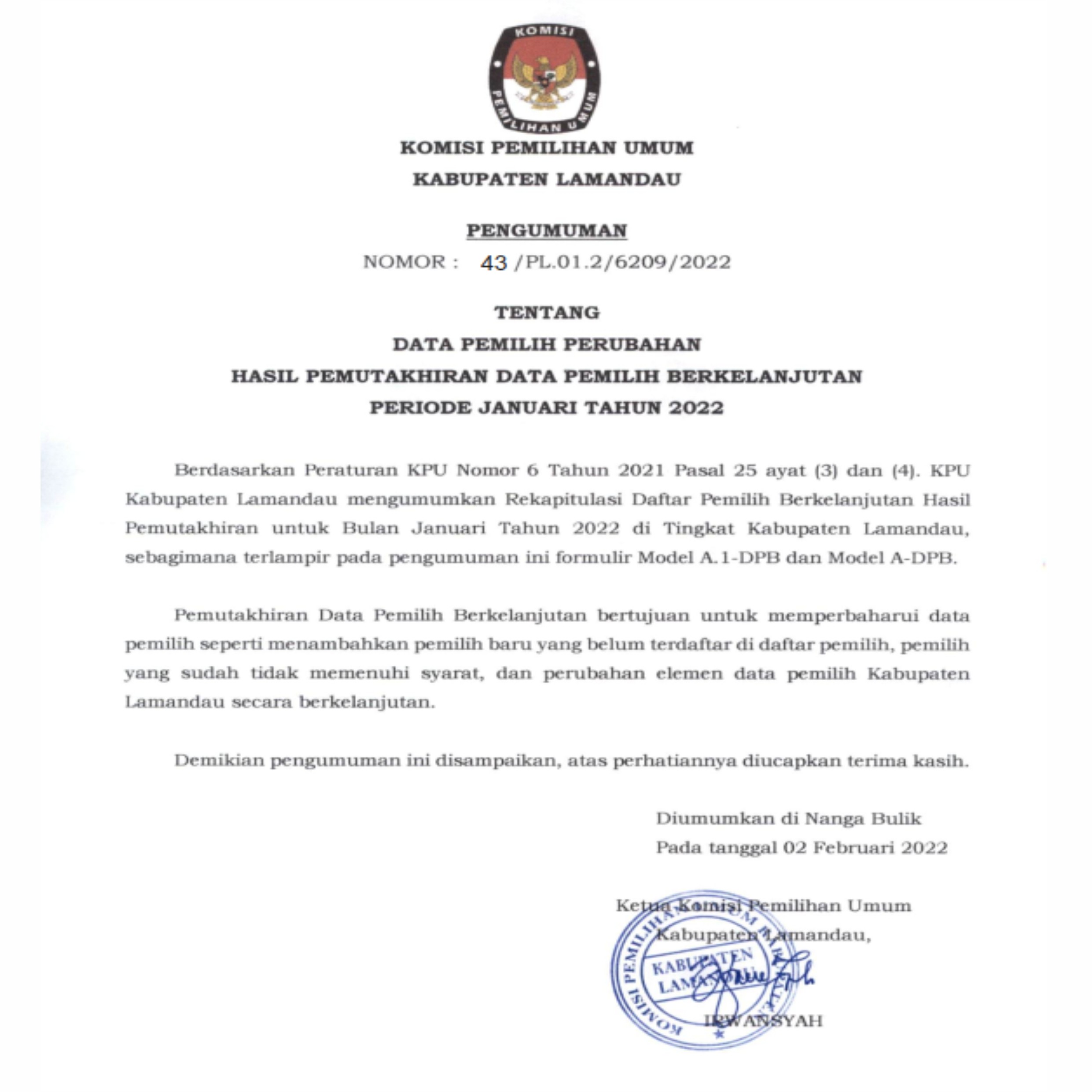 Komisi Pemilihan Umum Kabupaten Lamandau melaksanakan kegiatan Pemutakhiran Daftar Pemilih Berkelanjutan Periode Januari Tahun 2022. Berdasarkan Peraturan Komisi Pemilihan Nomor 6 Tahun 2021 tentang Pemutakhiran Data Pemilih Berkelanjutan.