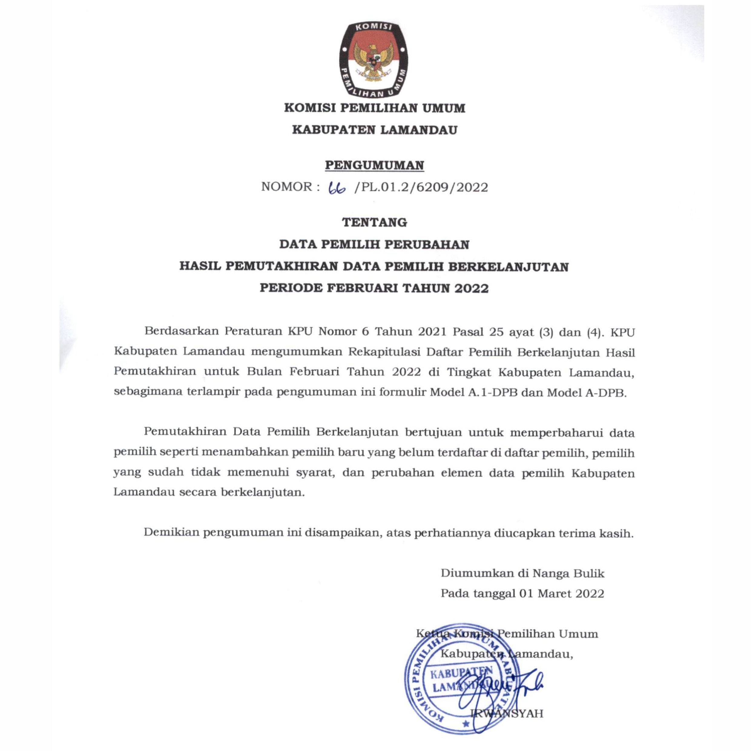 Pengumuman Tentang Data Pemilih Perubahan Hasil Pemuktahiran Data Pemilih Berkelanjutan Periode Februari Tahun 2022