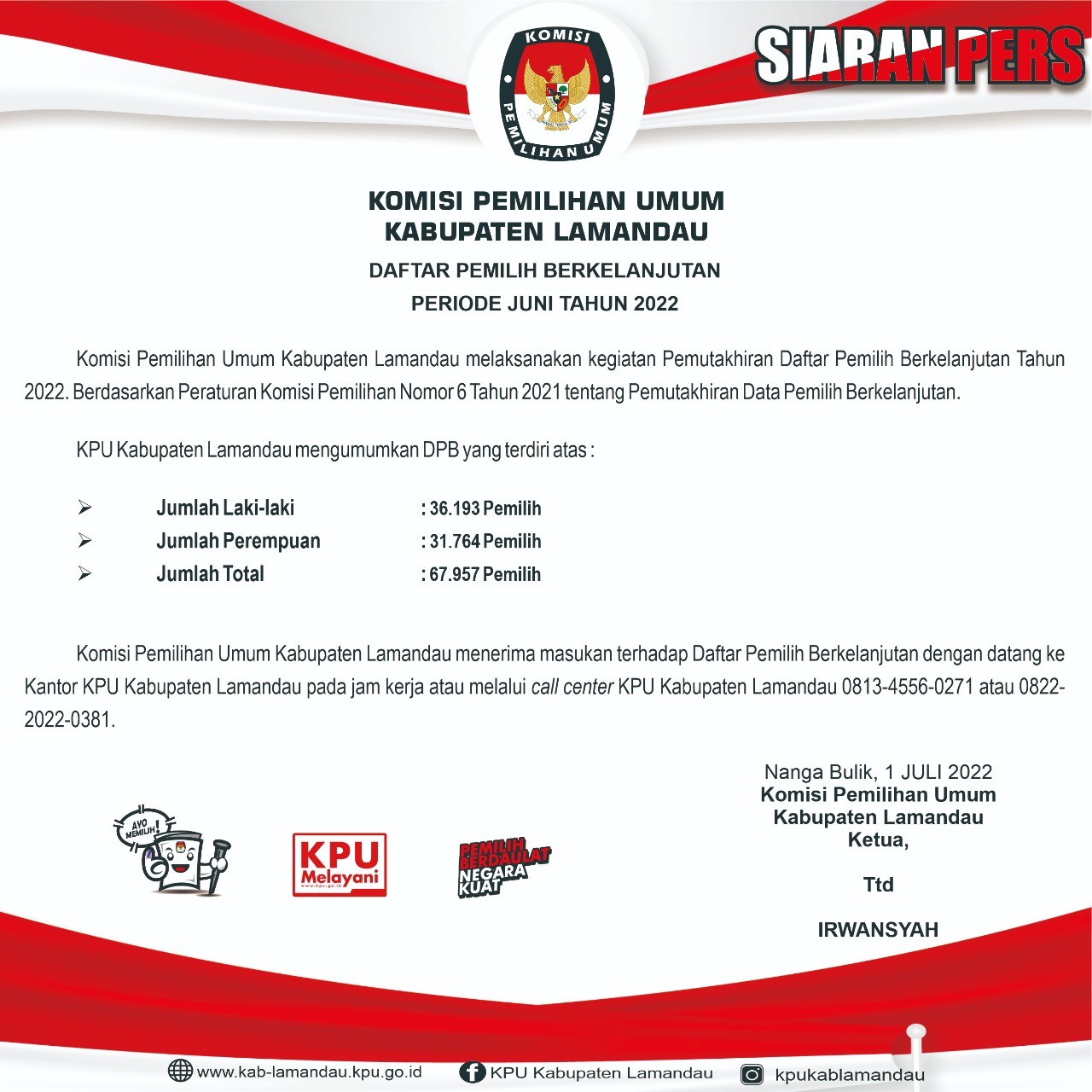 Komisi Pemilihan Umum Kabupaten Lamandau melaksanakan kegiatan Pemutakhiran Daftar Pemilih Berkelanjutan Periode Juni Tahun 2022. Berdasarkan Peraturan Komisi Pemilihan Nomor 6 Tahun 2021 tentang Pemutakhiran Data Pemilih Berkelanjutan.