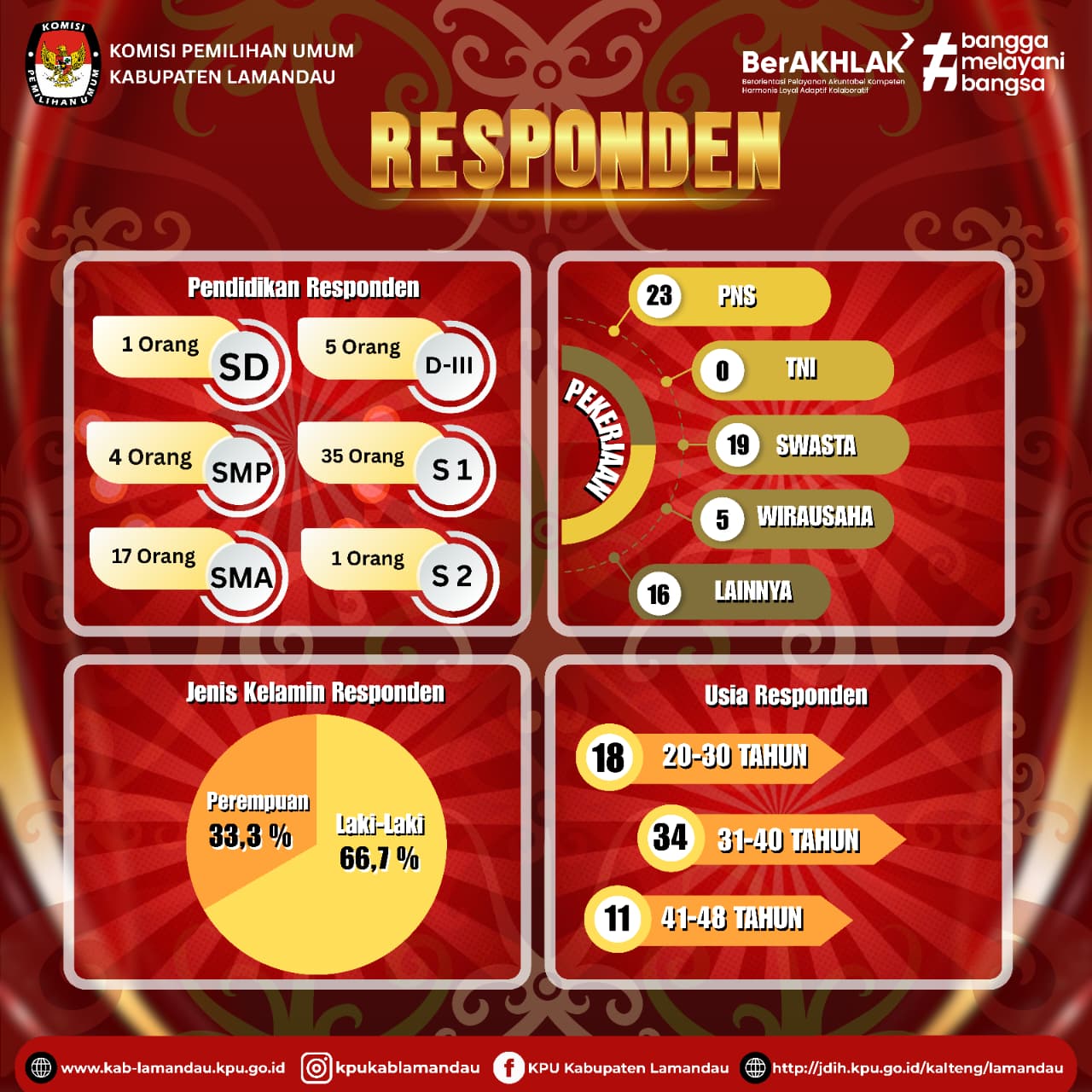 Sebagaimana tertera pada infografis di atas, urvei ini melibatkan responden dari berbagai latar belakang pendidikan, usia, pekerjaan, dan jenis kelamin. Dari sisi pendidikan, mayoritas responden adalah lulusan S1 (35 orang), disusul lulusan SMA (17 orang), SMP (4 orang), SD (1 orang), D-III (5 orang), dan S2 (1 orang).