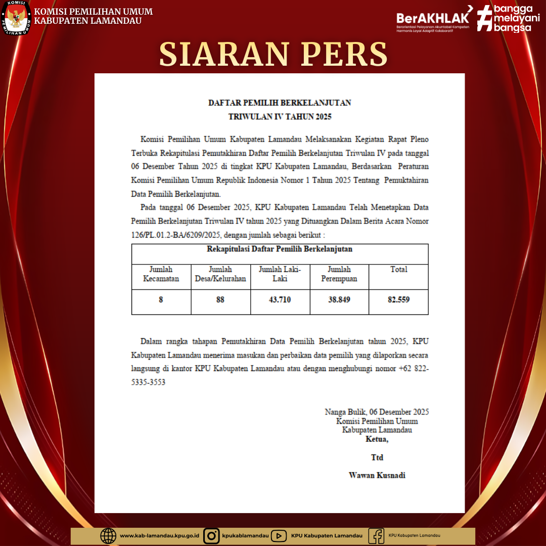 Melalui siaran pers ini, KPU Kabupaten Lamandau menyampaikan informasi terkait Rekapitulasi Data Pemilih Berkelanjutan Triwulan IV Tahun 2025.