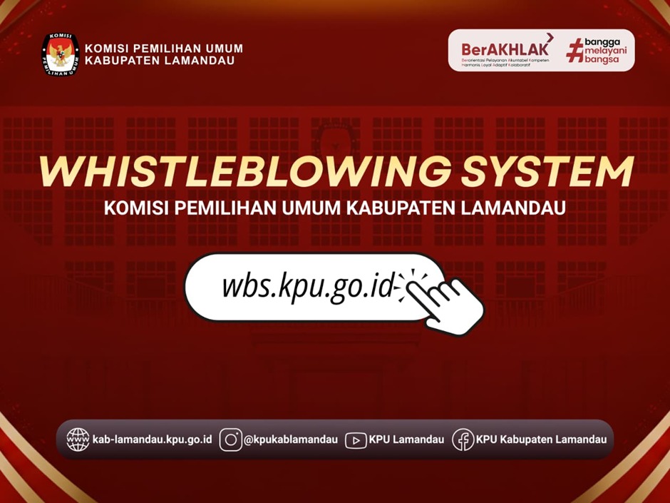 Whistleblowing System (WBS) adalah sistem penanganan pengaduan yang disediakan oleh KPU Kabupaten Lamandau sebagai sarana resmi bagi pegawai dan pihak terkait untuk menyampaikan informasi atau pengaduan mengenai dugaan pelanggaran, baik Tindak Pidana Korupsi (TPK) maupun Non TPK, yang terjadi di lingkungan KPU.