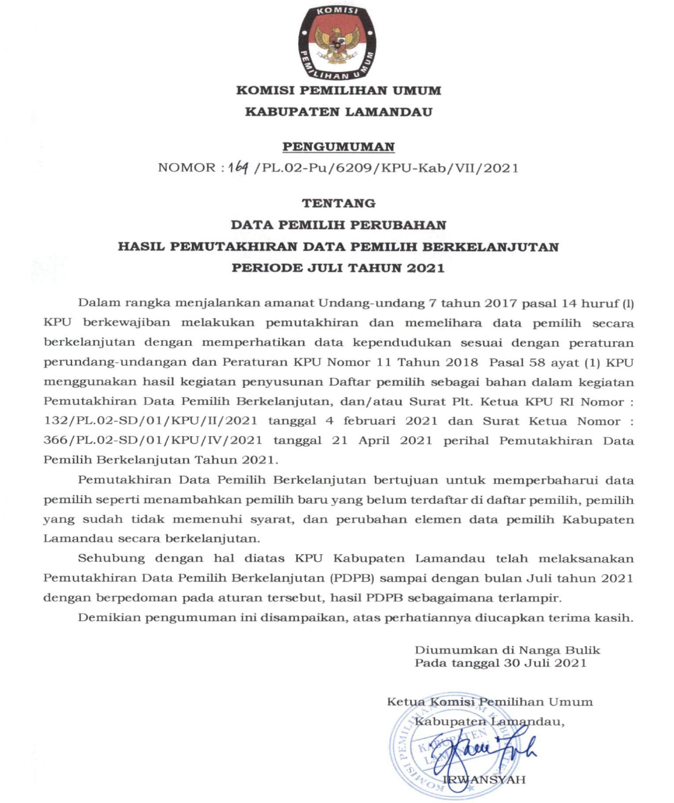 Pengumuman Pemutakhiran Daftar Pemilih Berkelanjutan Kabupaten Lamandau Periode Bulan Juli Tahun 2021