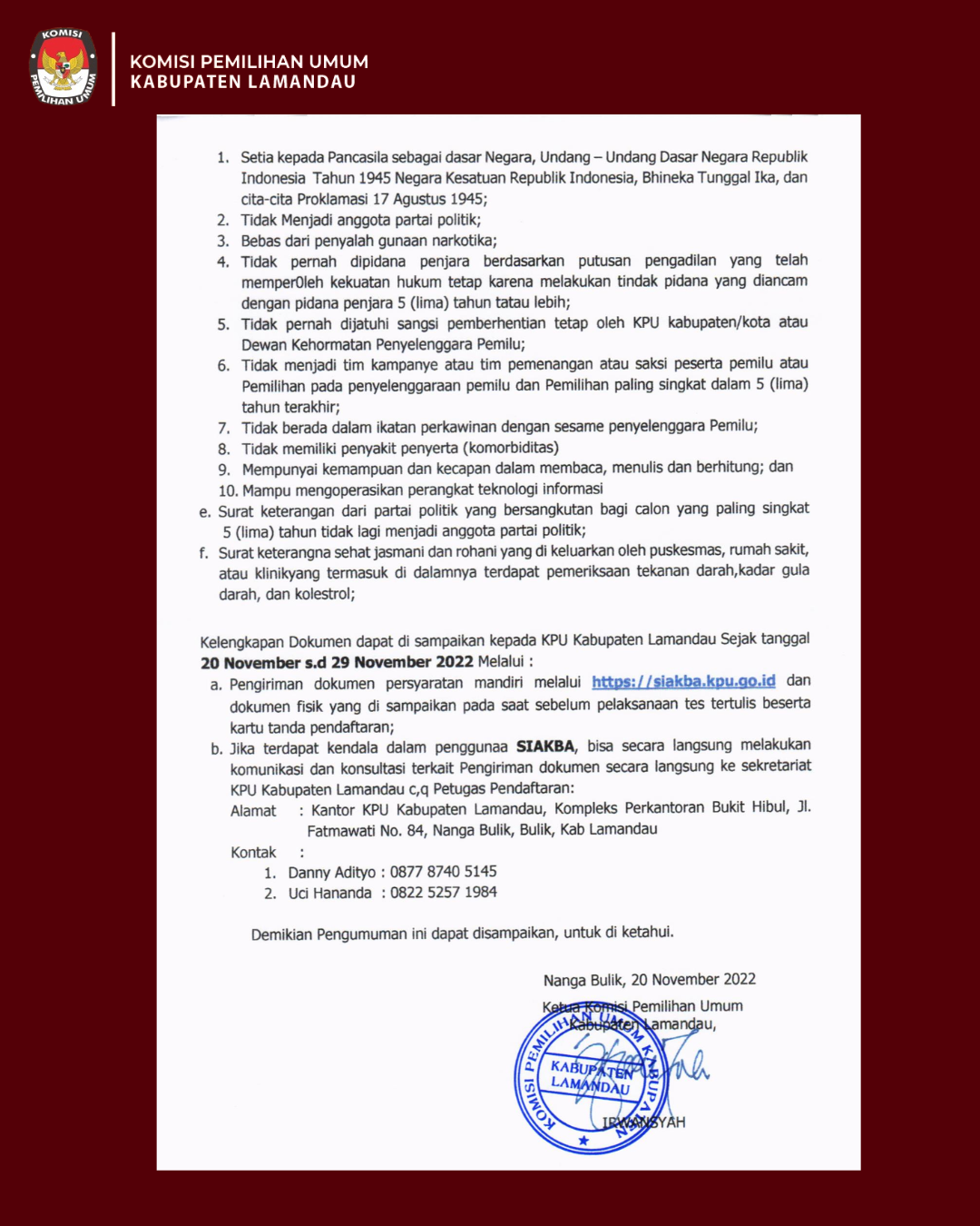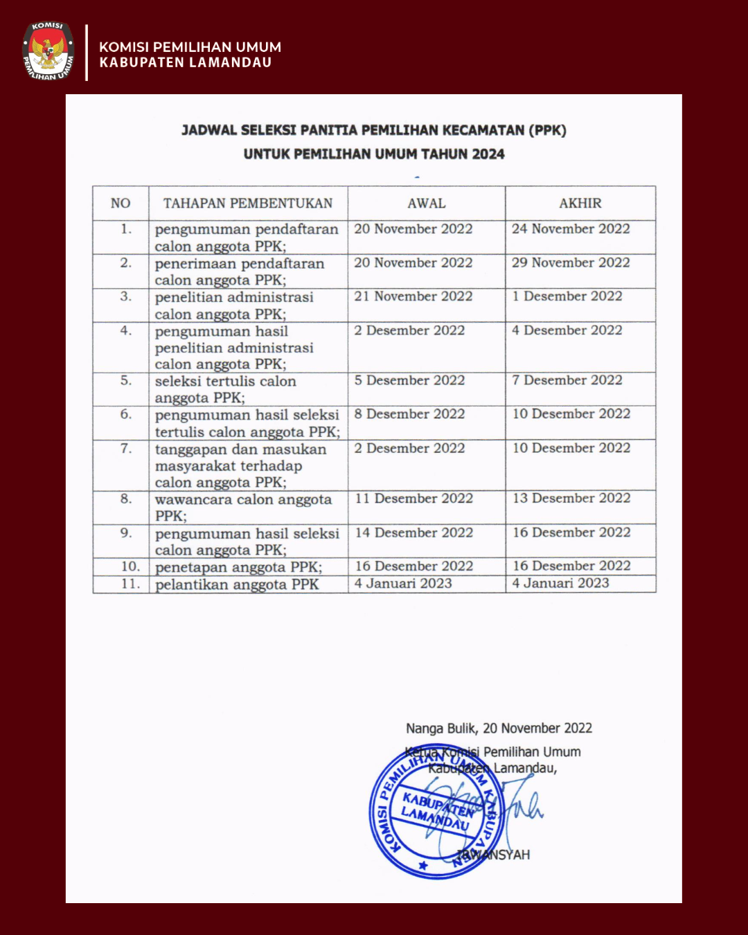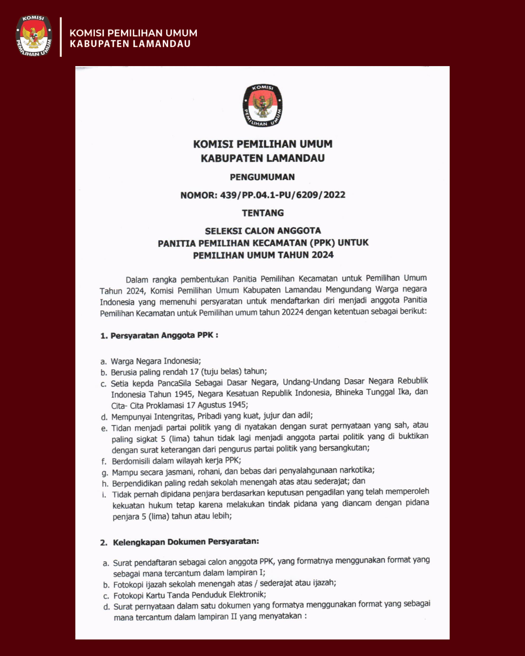 Pengumuman Seleksi Calon Anggota Panitia Pemilihan Kecamatan (PPK) untuk Pemilihan Umum Tahun 2024